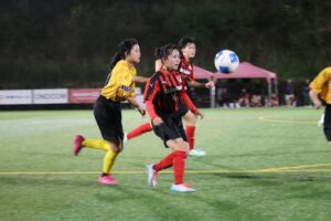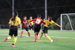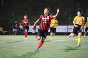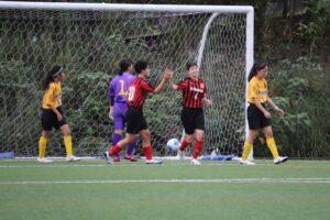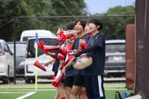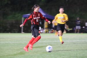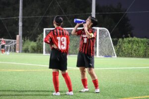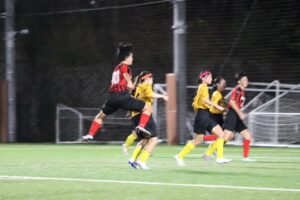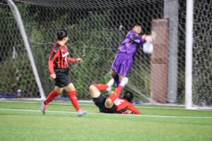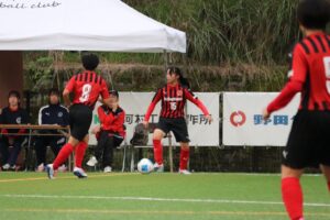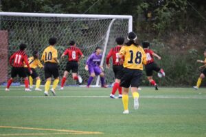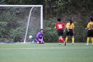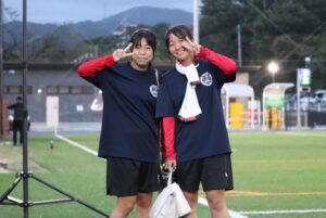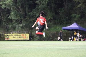 試合は前半3分しいなが抜け出し、先制ゴール。なおも攻撃の手を緩めず、前半20分、29分とえまが得意の形で追加点。39分にはせいらがヘッドで決め、4対0で前半を折り返す。後半5分にOWNゴールで追加点。点差はついても、決して諦めない安城学園。次々と足が攣り、傷んでも立ち向かってくる。その気迫に攻めあぐむ時間帯が続いたが、終了間際にかづきが連続で押し込み、7対0で試合終了。これで決勝進出を決めた。続く、豊川高校対同朋高校の対戦は3対2で豊川高校が勝利した。