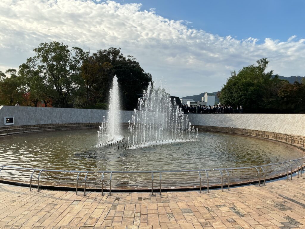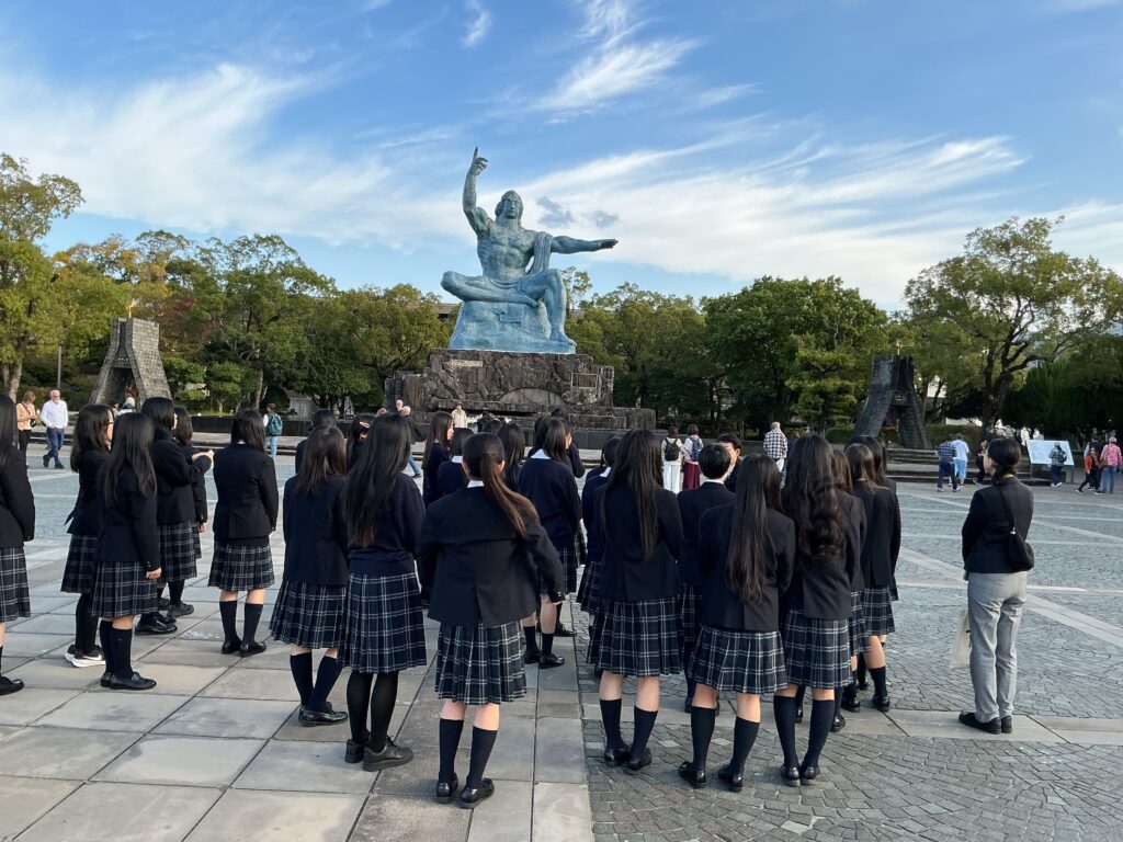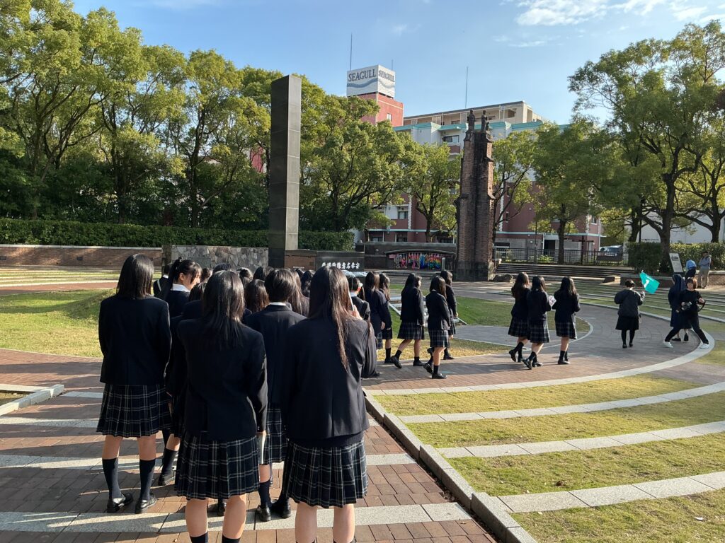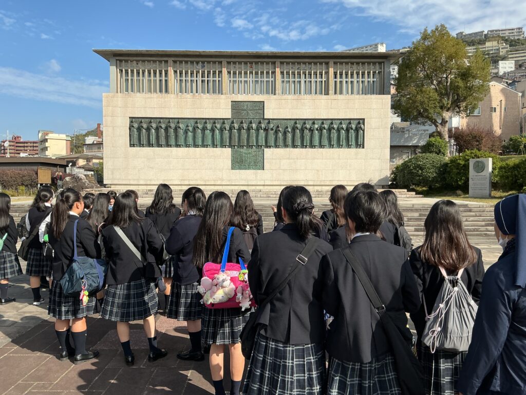 11月10日(月)、2日目の最初の目的地は「平和公園」。「平和祈念像」の前で集合写真を撮る。この有名なポーズ、右手は原爆を示し、左手は平和を、顔は戦争犠牲者の冥福を祈るという想いが込められているそうだ。その後、バスガイドさんの案内で公園を歩く。「平和の泉」は原爆の被害に遭い、水を渇望しながら亡くなっていった方々の冥福と平和を祈るために建設された泉である。それから「原爆落下中心地」の碑の前に立って、祈りを捧げる。この場所には「浦上天主堂の遺壁」の一部も移設されている。爆心地から約500メートルに位置していた浦上天主堂は全壊し、戦後、再建するために廃墟となった壁の一部を移設したものである。平和公園から歩いて「長崎原爆資料館」に向かった。原爆の被害の悲惨さを物語る展示に目を覆いたくなるのを抑えつつ、その時代に生きた方々に思いを馳せ、原爆の脅威と平和の尊さについて改めて実感する。
