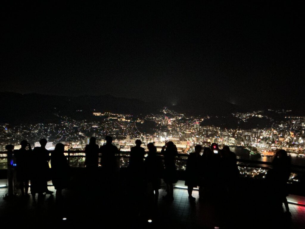 ホテルで早い夕食を取った後、私たちはスロープカーに乗車して「稲佐山」の山頂に登った。函館山(函館市)、摩耶山(神戸市)とともに「日本三大夜景」に数えられる、まさに絶景である。何千何万もの光が競演して作り出す夢のような世界。しかし、その一つ一つを辿れば、それぞれに光を灯して日常を生きる人々の営みがある。