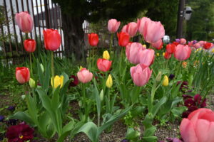 入学式の日、桜とチューリップの花が咲き誇り、新入生を温かく迎えてくれました。