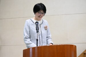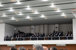 式典の最中、雨が持ちきれなくなったのか、バケツをひっくり返したように雨がカリタスホームの屋根をたたきつけ始めました。その激しい雨の音に自分たちの声がかき消されないようにと、3年生は大きな声で聖歌を歌っている姿に、後輩に対する想いが伝わってきました。